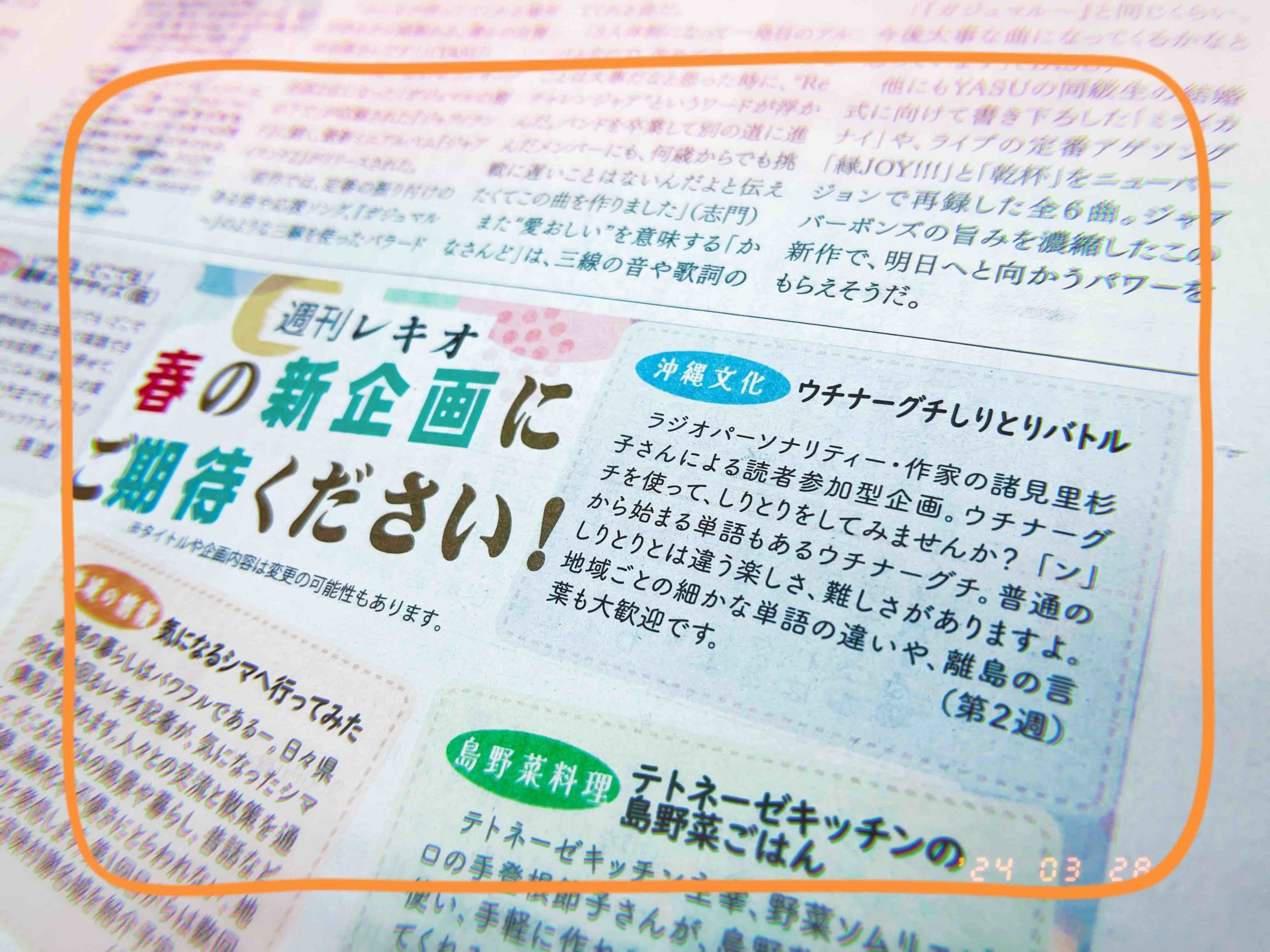 4月から諸見里杉子が週刊レキオで「ウチナーグチしりとりバトル」と題して連載します。